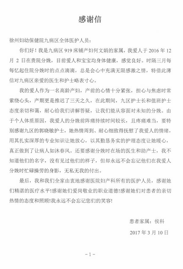 患者致信感謝淩敬敬、郭曉敏九區全體醫護人(rén)員和產房助產士醫生
