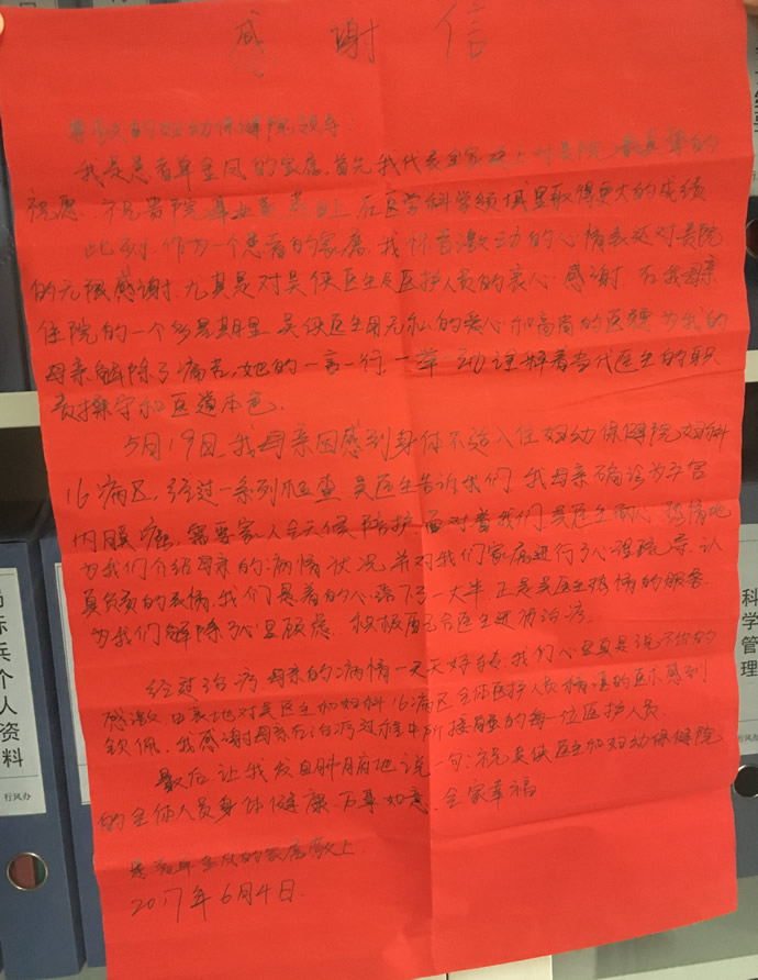 患者致信(xìn)感謝(xiè)吳俠醫生及全體醫務人員