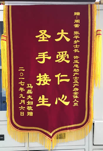 錦旗贈我院周雷、張(zhāng)平(píng)護(hù)士長,許玉忠助(zhù)產士及產房全體人員