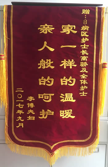 錦旗贈我院七病區吳慶榮主任、盧彩紅大夫及全體醫護人員