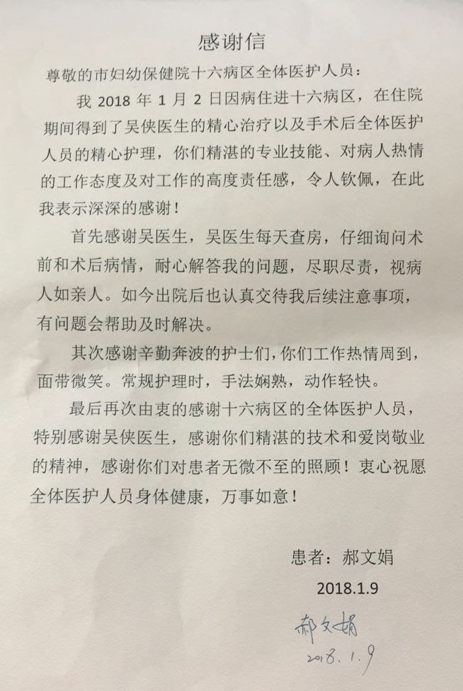 患者致信(xìn)感謝我院(yuàn)十六病區(qū)全體醫護人員