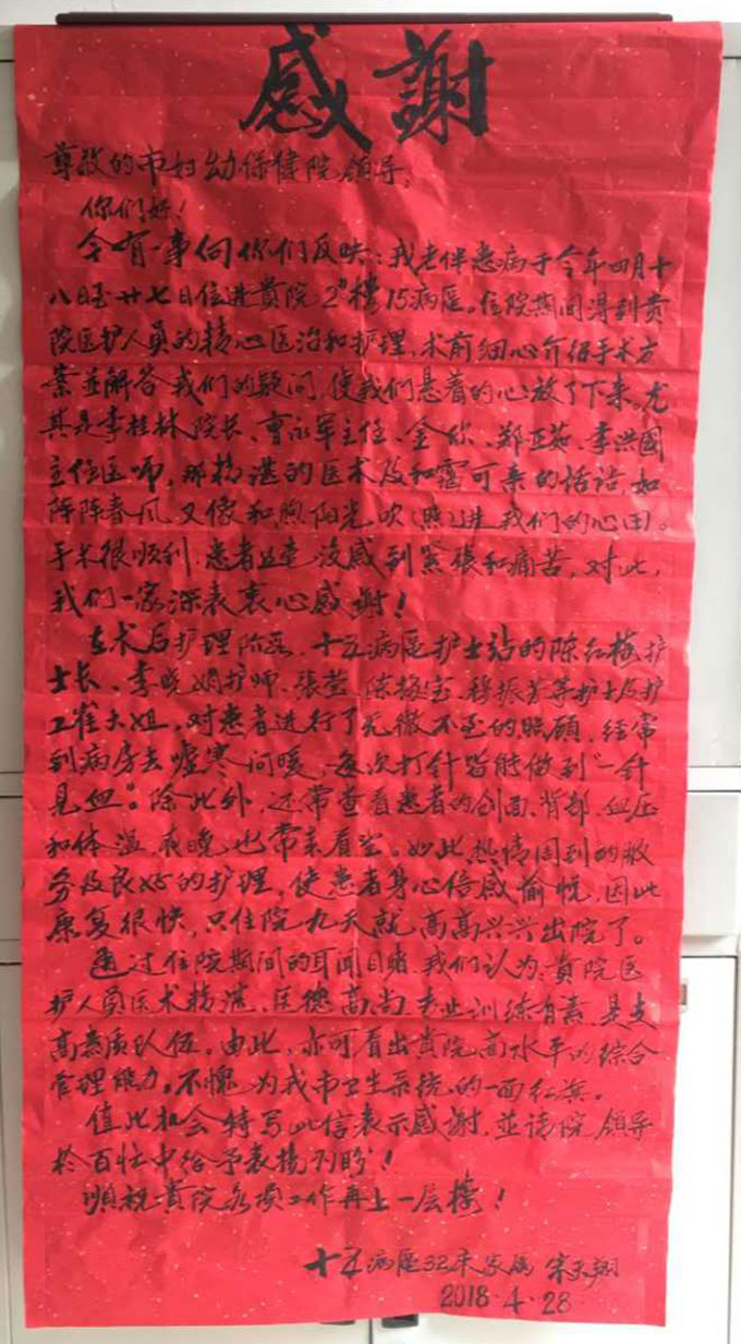 患者致信感謝(xiè)李桂林院長、曹永(yǒng)軍(jun1)主(zhǔ)任及十五病區全體醫護人員