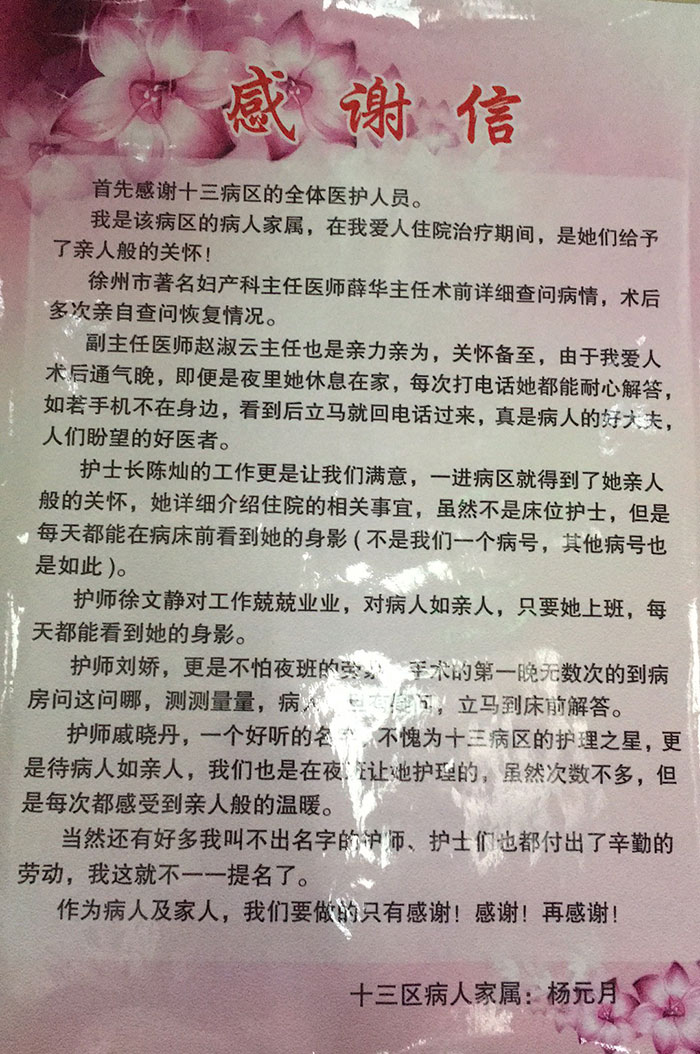 患者致信感謝我院十三病區全體醫護人員(yuán)