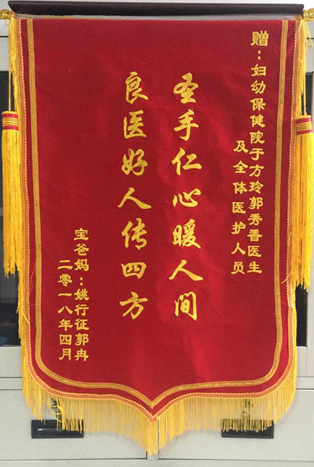 錦旗贈我院於方玲、郭秀香醫生及全體醫護(hù)人員