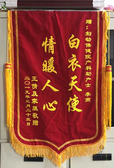 王(wáng)倩贈錦旗感謝我院產科助產士 李燕