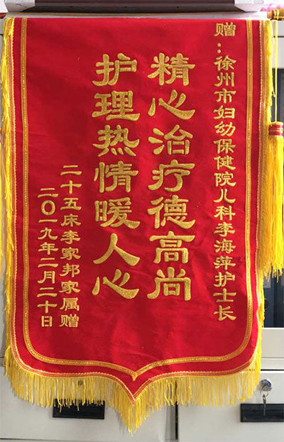 李家邦贈(zèng)錦旗感謝我院兒科李海(hǎi)萍護士長