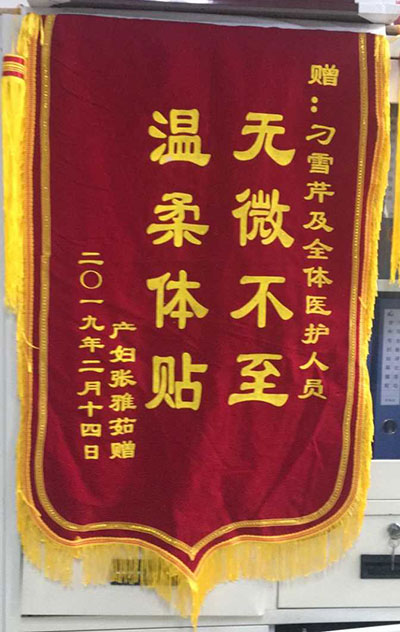 張雅茹(rú)贈錦旗感謝我院刁雪芹及全體醫(yī)護人員