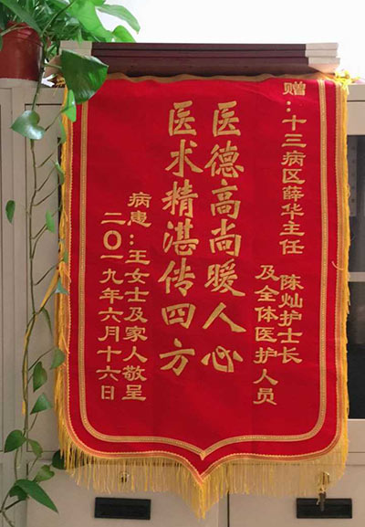 王女士贈錦旗感謝我院十三(sān)病區薛(xuē)華、陳燦及全體醫護人員