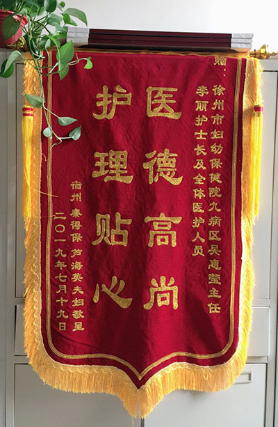 秦得保贈錦旗感謝我院九病區吳惠瑩、李麗及全體醫護人員