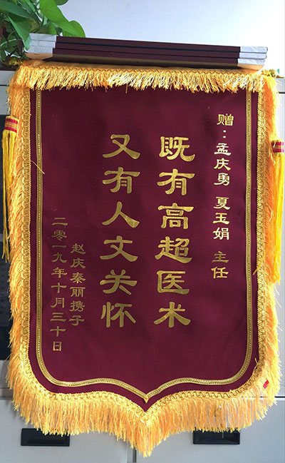 趙慶贈錦旗感謝我院(yuàn)孟慶勇、夏(xià)玉(yù)娟