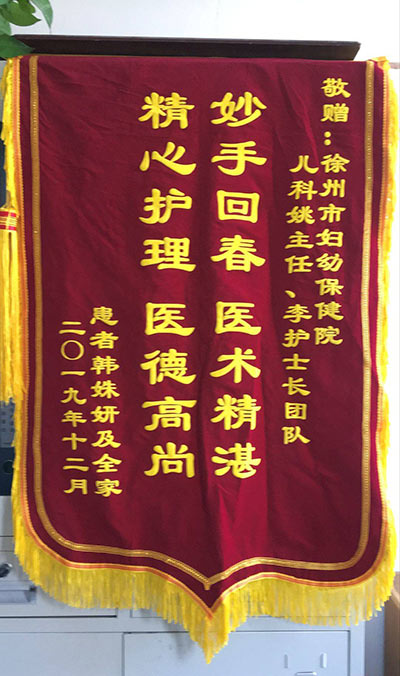 韓姝妍贈錦旗感謝我院兒科姚叢月、李海(hǎi)萍及全體醫護人員