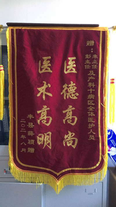 薛穎贈錦旗感謝我院產科朱錦明、彭鳳雲及全體醫護人員