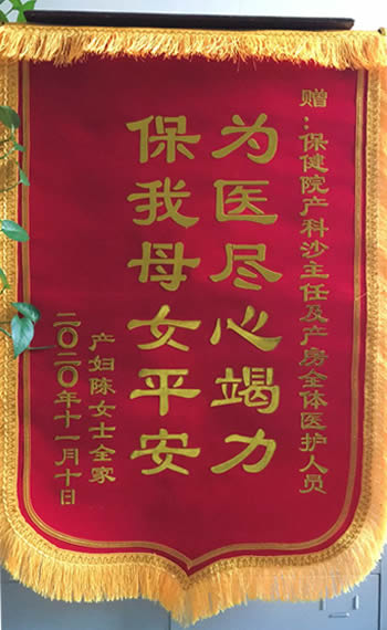 陳(chén)女士贈錦旗(qí)感謝我院產科沙(shā)小龍及全體醫(yī)護(hù)人員