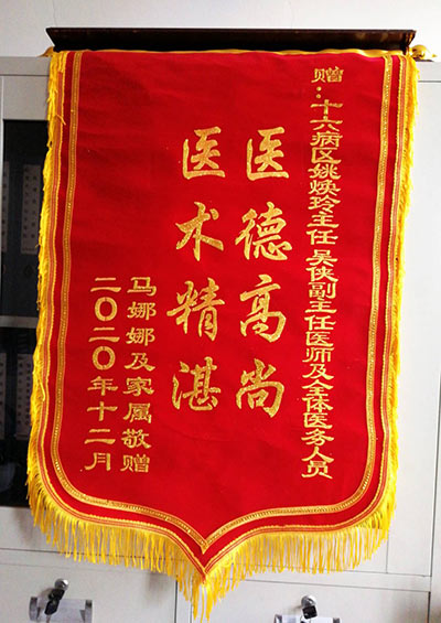 馬娜娜贈錦旗感(gǎn)謝我院十六病區(qū)姚煥玲、吳(wú)俠及全體醫護人員(yuán)