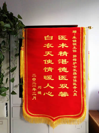 劉婕贈錦旗感謝(xiè)我院朱錦明、郭梅及全體醫護人員
