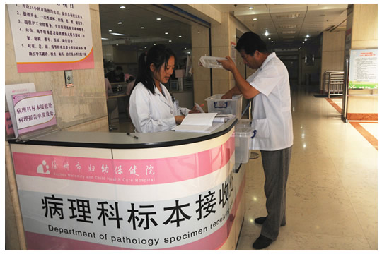 近期(qī),部分病人及家屬反映病理科位(wèi)置(zhì)較偏(piān),送取病(bìng)理標本不便。為切實解決(jué)這一問題,醫院討論決定在門診大廳服務台東側設立“病理科(kē)標本接收處”,把與患者聯係最為(wéi)密切的住院病人TCT和病(bìng)理標本的接收、送檢及發放工作(zuò)轉移到一樓並派專人負責。病理科工作人員每日定時來收取標本(TCT每半個小時取一(yī)次(cì)、病理標本上、下午(wǔ)各取兩次)並做好(hǎo)各項(xiàng)交接(jiē)登記。便民服務台(tái)工作時間(jiān)與醫院正常作息一致,需特別指出的是大(dà)手術室標(biāo)本、節假日、非正常工作時間仍需送達5樓病理科。