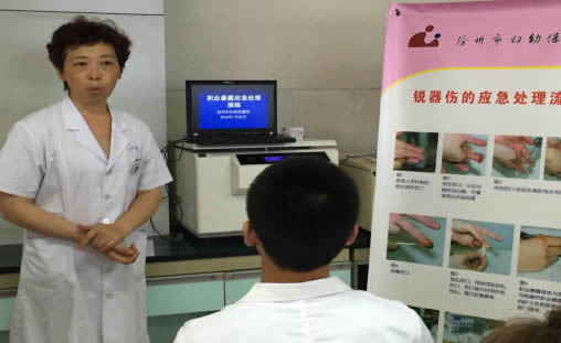 我(wǒ)院(yuàn)感染管理科科長孫晚霞首先對工作人員進行了職業暴露(lù)處置流程、職業防護措(cuò)施(shī)標準預防的培訓。演(yǎn)練開始,工作人員模擬在診療過程中針刺傷(shāng)職業暴露,針刺傷發生後應立即按照擠血、衝洗、消毒、報(bào)告、評估、谘詢(xún)與隨訪等流程進行處置。