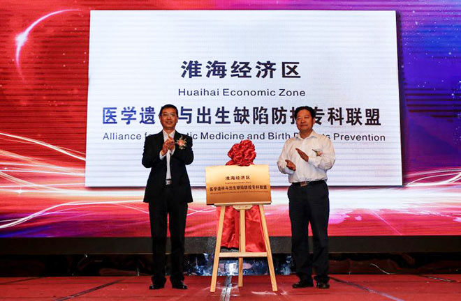 (鄭葵(kuí)陽(yáng)校長與吳憲主任為“淮海經(jīng)濟區醫學(xué)遺傳(chuán)與出生缺陷防控專科聯盟”揭牌)