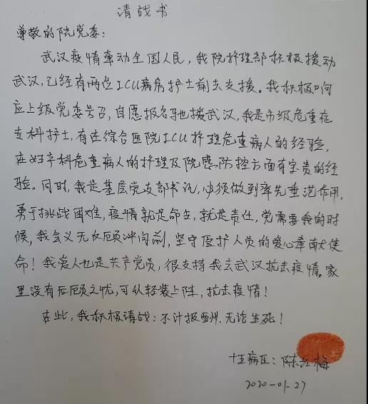 “不忘初心,牢記使命”。身為共(gòng)產黨員,陳紅梅護士長在接到誌願者報名的第一時間,鄭重向院黨委提出申請,遞交請戰書,她將(jiāng)無懼生(shēng)死的決心和大醫蒼生的無私情懷注入(rù)筆下,沒有猶豫,果敢堅毅。