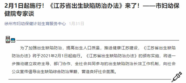 徐州市婦幼保健院及徐州市婦幼保健計劃生育服務中心通過公眾號宣傳《江蘇省出生缺陷(xiàn)防治辦法》