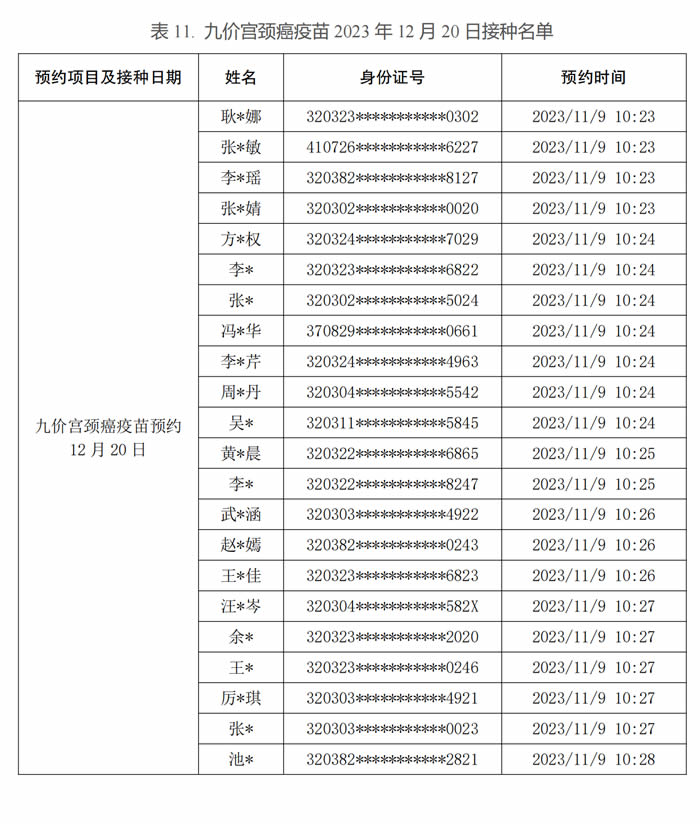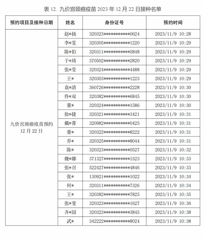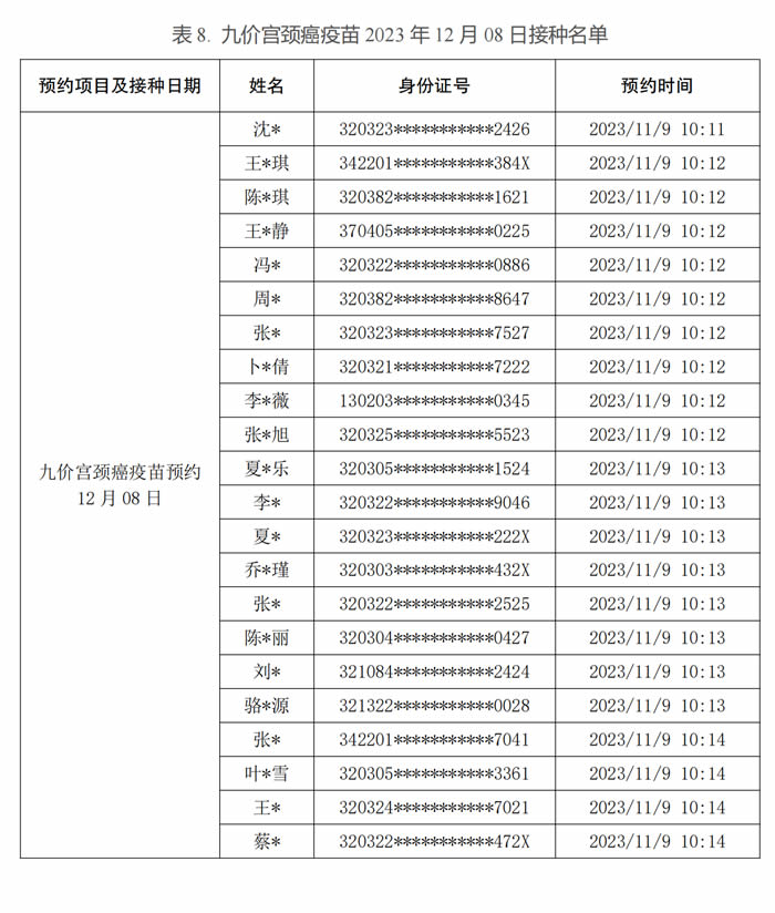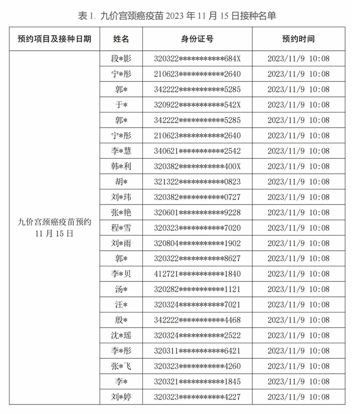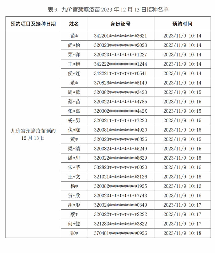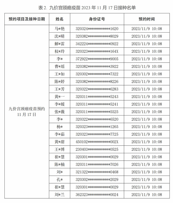 2023年11月9日徐州市婦幼保健院成人預防接種門診九價宮頸癌疫苗線上預約成功名單公示,請預約成(chéng)功的女士於相(xiàng)應接種日上午8:00-11:30、下午13:30-16:30,攜(xié)帶本人身份證(zhèng)、就診卡、醫保卡及預約信息至我院成人預防接種門診(三號樓四樓)辦理接種。如未在規(guī)定時間前來接(jiē)種,視為自動放棄。