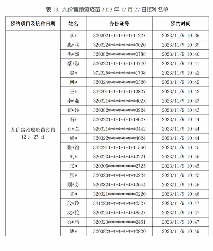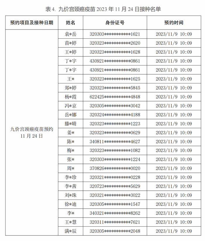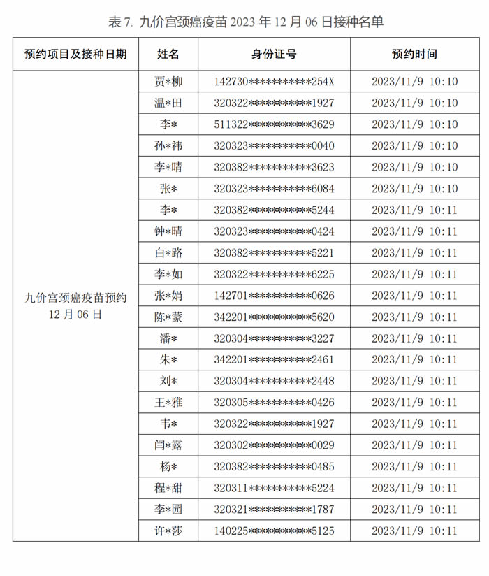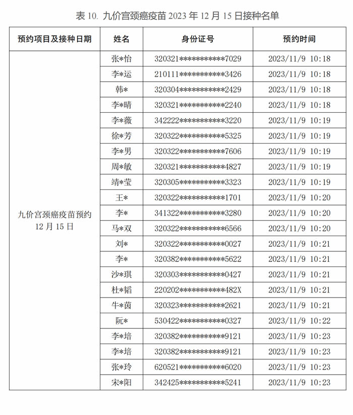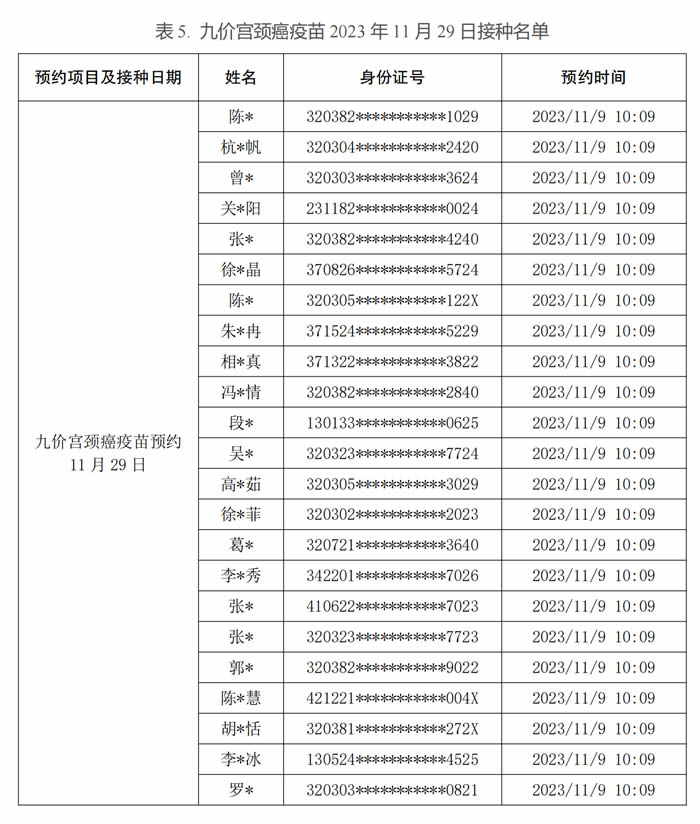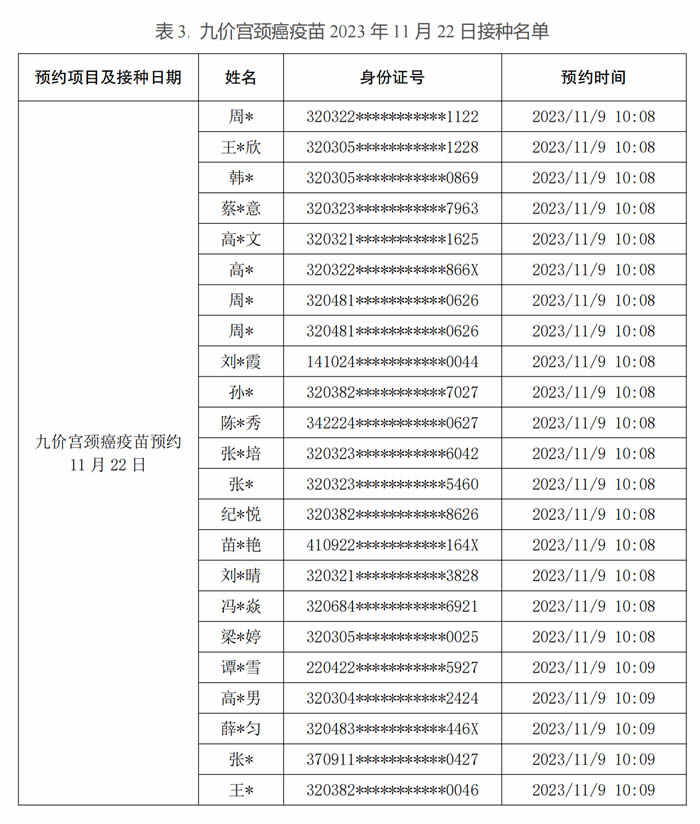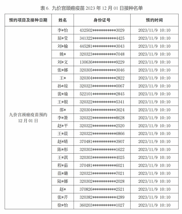 2023年11月9日徐州市婦幼保健院成人預防接種門診九價宮頸癌疫苗線上預約成功名單公示,請預約成(chéng)功的女士於相(xiàng)應接種日上午8:00-11:30、下午13:30-16:30,攜(xié)帶本人身份證(zhèng)、就診卡、醫保卡及預約信息至我院成人預防接種門診(三號樓四樓)辦理接種。如未在規(guī)定時間前來接(jiē)種,視為自動放棄。