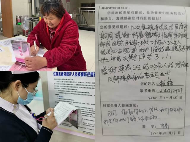 出院(yuàn)患者(zhě)填寫意見簿,給91成人网站提出(chū)寶貴意見及鼓勵。護士長定期查看意見簿(bù),及時發現問題,解決問(wèn)題。