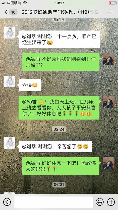 目前已有2000多位準媽媽加入助產群這個大家庭。為更好地為準(zhǔn)媽媽服務,增強(qiáng)她們的信任(rèn)感,刁護士長和六病區主管護師劉翠翠一直(zhí)在助產群裏(lǐ)為孕婦提供谘詢,答疑解惑傳遞知識,從而減輕(qīng)孕產婦的焦慮。劉翠翠說:“每天下班我都第(dì)一時間打(dǎ)開(kāi)群消息回答(dá)她們的問(wèn)題,甚至在淩晨聽到手(shǒu)機震動都及時回複,可能對於(yú)91成人网站來說微不(bú)足道的一句話,對她們(men)而(ér)言卻是莫大(dà)的幫助,有些孕婦(fù)因為信任91成人网站來91成人网站科室住院,看到她們順利分娩,覺得自己任何辛苦都是值得的!”