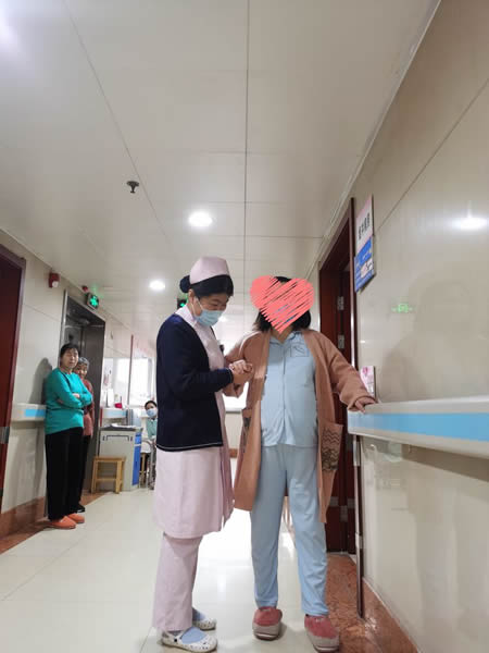 但護士不放心。圖為薛曉敏護士扶著她慢(màn)慢的走出臥床三個月以來的第(dì)一步。在護士的指導和幫助下,她感到越來越(yuè)從容不迫了。